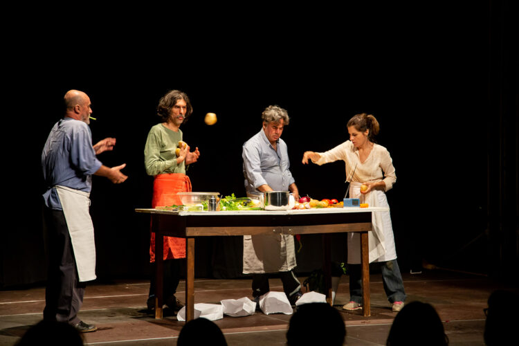 Il “Sandokan” o la fine dell’Avventura di Sacchi di Sabbia si svolge in una cucina piena di confusione: carote-soldatini, sedani-foresta, pomodori rosso sangue, patate-bombe, prezzemolo orna-mentale. E le risate sono fragorose tra cucchiai di legno come spade, grattugie come cannoni, una bacinella piena d’acqua per il mare del Borneo, scottex per cannocchiali, e ancora sacchetti di carta, coltellini, tritatutto…Il racconto si affaccia alla mente degli spettatori, per poi esplodere con una frenesia folle che contagia