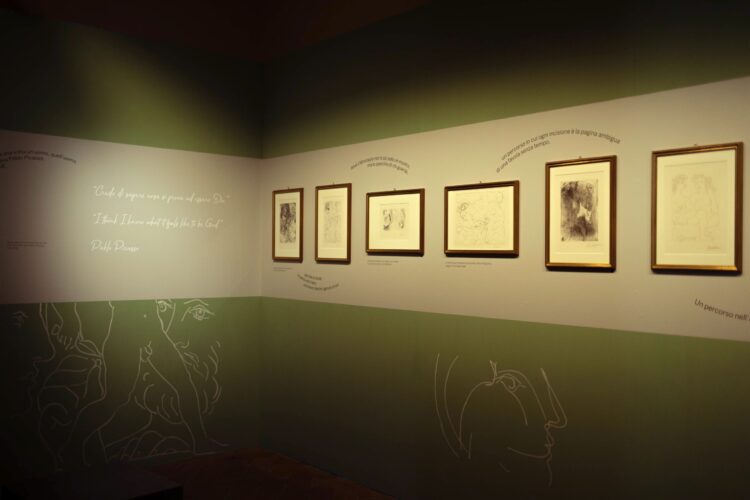 Nelle nobili sale di Palazzo Ferretti, la Suite viene presentata in un allestimento narrativo del tutto inedito: un racconto visivo costruito come una lunga striscia disegnata, un graphic novel d’artista in cui ogni incisione è una vignetta, ogni scena una finestra sull’animo inquieto di Picasso.
