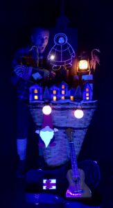 “Quando ero piccolo abitavo in montagna e ogni Natale saliva in paese, accompagnato dal suono della sua cornamusa, Yule, detto la luce del Natale. Arrivava con un sacco pieno zeppo di regali: luminarie, strumenti musicali, sorprese, spaventi e risate. Yule conosceva tutte le canzoni, tutte le musiche, tutte le storie di Natale. ‘Quando il mondo si fa buio tu regala un po’ di Luce’, diceva a noi bambini. Qualcuno in paese sosteneva che Yule fosse un folletto dei boschi del Nord, mah! Chi lo sa… Qualcun altro che fosse solo un vecchio viaggiatore che conosceva le storie luminose del mondo, mah! Chi lo sa… Addirittura c’era chi arrivava a dire che fosse Babbo Natale che non voleva farsi riconoscere, mah! La verità é che quando Yule cominciava a raccontare, noi bambini vedevamo nei suoi occhi la luce del Natale. Quando il mondo si fa buio tu regala un po’ di Luce diceva Yule, e le storie, i gesti e le canzoni dello spettacolo faranno luce sul Natale di tutti noi”.