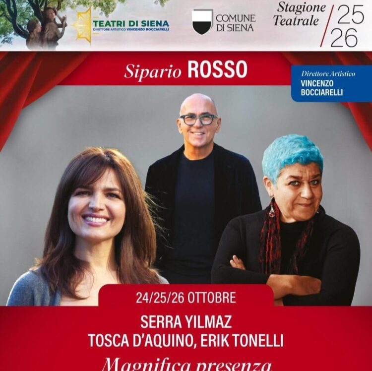 SIENA. Si alza il sipario sulla stagione 2025-2026 dei Teatri di Siena, per la direzione artistica di Vincenzo Bocciarelli. La serata inaugurale, con il ‘red carpet’ all’interno del Cortile del Podestà e una sfilata di grandi nomi del mondo dello spettacolo, è in programma venerdì 24 ottobre a partire dalle ore 20. Quindi il via, alle ore 21, al primo fine settimana di spettacoli, con l’apertura del “Sipario Rosso” al Teatro dei Rinnovati: protagonista la commedia di Ferzan Ozpetek “Magnifica presenza” con Serra Yilmaz.