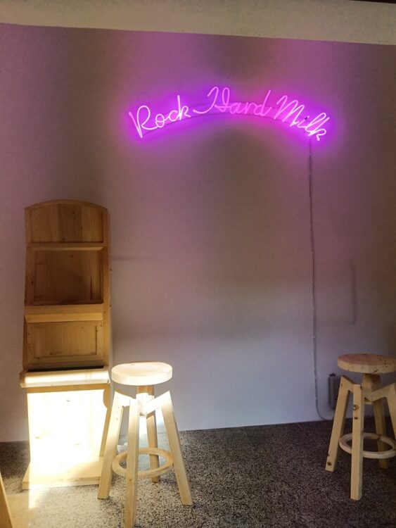 L’opera sarà visibile 24 ore su 24, fino al 29 settembre, in una latteria dismessa da molti anni in via Fratelli Rosselli, 13. Lo spazio ospita l’insegna a neon con la scritta Rock Hard Milk, che colora di ciclamino la vecchia latteria e l’area circostante evocando la sua lavorazione e l’attaccamento quasi materno fra la comunità di Serre di Rapolano e il travertino. Entrando, inoltre, si sente l’odore del cedro e del cipresso emanato dalle sculture in legno realizzate da una falegnameria locale su indicazione dell’artista per riprodurre