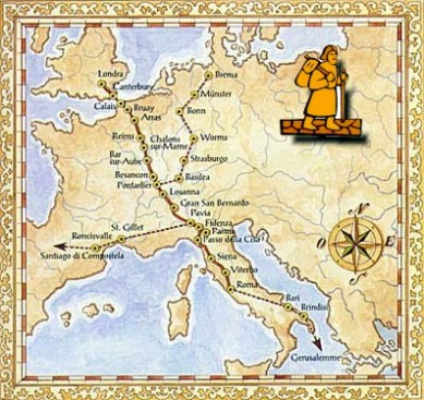 Nata con la destrutturazione del sistema viario all'indomani del collasso dell'impero romano, la strada Francigena, o Romea, rappresenta per secoli una delle vie di traffico più importanti della Cristianità fino alla piena età moderna. Asse di collegamento fra il sud dell'Inghilterra e Roma, costituita non da un'unica arteria ma da una serie di percorrenze parallele, la strada Francigena contribuisce allo sviluppo urbano e sociale di numerose località. A beneficiarne sono città, castelli, monasteri che esercitano sulle tratte più vicine i loro diritti o, non di rado, i loro soprusi.