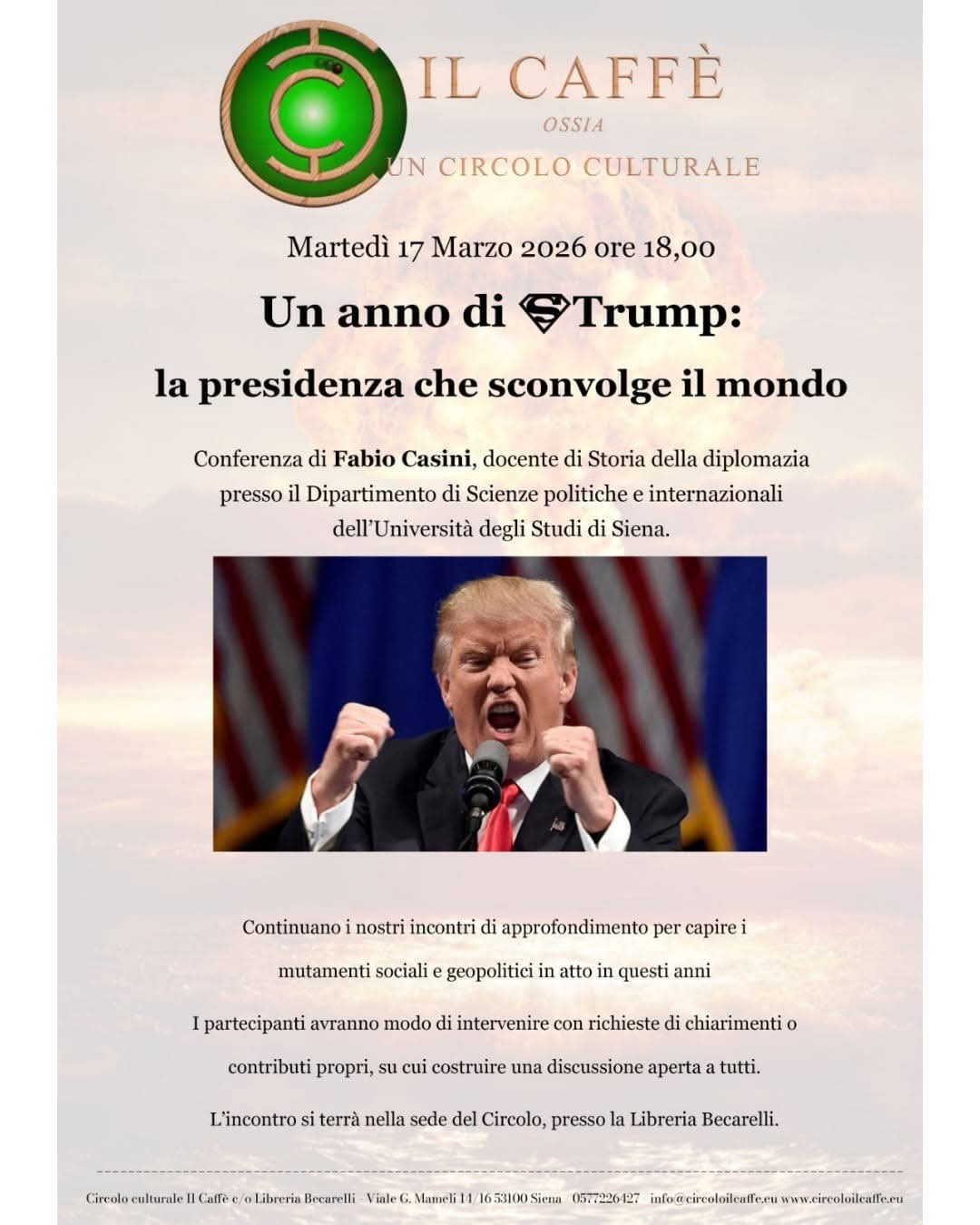 Martedì 17 marzo 2026 alle ore 18.00 discuteremo insieme di uno dei fenomeni politici più dirompenti degli ultimi anni: il ritorno di Donald Trump alla Casa Bianca e le conseguenze che la sua presidenza sta producendo negli equilibri internazionali.