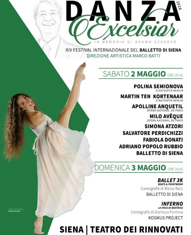 Ad aprire il Festival, sabato 2 maggio alle ore 20:45, sarà il Galà Excelsior: una serata che porta in scena alcune tra le più luminose presenze della danza internazionale. Polina Semionova e Martin ten Kortenaar dalla Staatsoper Berlin, Apolline Anquetil e Milo Avèque dall’Opéra National de Paris, insieme a Simona Atzori, Salvatore Perdichizzi, Adriano Popolo Rubbio con Fabiola Donati, i danzatori del Balletto di Siena: artisti diversi per percorso e sensibilità, uniti dalla stessa capacità di trasformare il movimento in emozione.