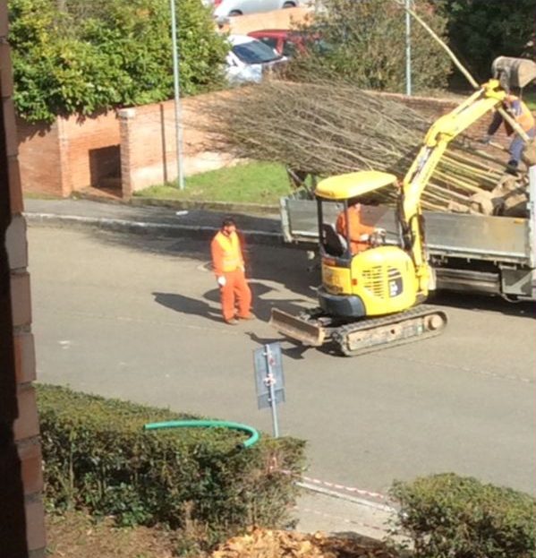 SIENA. Qualcuno ha acceso la luce. Oggi è una bella giornata. Insieme con i leccini di Via Pisacane, in sostituzione dei pini abbattuti, sono arrivati in Via Napoli dei promettenti giovani peri. Poche azioni veloci: un trattore ha frantumato, grazie ad una impietosa talpa meccanica, quanto restava del tronco dei grandi pini; un camion ha trasportato un congruo numero di peri; una ruspa opportunamente attrezzata ha facilitato la messa a dimora dei giovani “sostituti”.