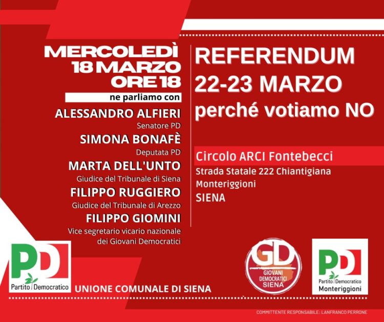 MONTERIGGIONI. Mercoledì 18 marzo 2026 alle ore 18:00, presso il Circolo ARCI Fontebecci, si terrà un incontro pubblico dedicato al tema del referendum del 22-23 marzo. Il titolo dell’incontro è “Perché votiamo NO”, vedrà la partecipazione di importanti esponenti politici e giuridici: Alessandro Alfieri, Senatore del Partito Democratico, Simona Bonafè, Deputata del Partito Democratico, Marta Dell’Unto, Giudice del Tribunale di Siena, Filippo Ruggiero, Giudice del Tribunale di Arezzo e Filippo Giomini, Vice Segretario Vicario Nazionale dei Giovani Democratici.