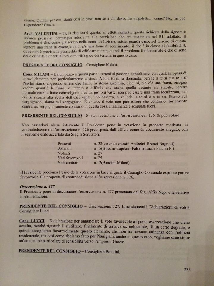 Ebbene, ecco cosa lo stesso Piccini dichiarava pubblicamente il 24 Gennaio 2011 nel Consiglio Comunale riunito per l’approvazione del Regolamento urbanistico, proprio riguardo all’area di Isola d’Arbia: “[…] che città volete per la grande distribuzione? Non si può fare il ragionamento mezzo sì e mezzo no, perché l’evasione commerciale di questa città non la recuperate non creando la grande struttura di distribuzione, non la create in questo modo, non venite incontro a questo, perché il senese vuole comprare a basso costo, va a Montevarchi, va vicino Arezzo, va da qualche altra parte, e compra comunque. Non aiuterete mai un processo di crescita qualitativa della struttura commerciale se non ci fate i conti effettivamente. Per questo non si capisce al momento. E’ sempre quel modo di dire: si, no, però manteniamo l’esistente, che non fa altro che mantenere le rendite di posizione […] questo è il modo di governare che lascia la ‘sienetta’ che poi non fa mai le scelte che servono per una reale crescita. Mantiene il consenso politico, può darsi che lo mantenga, ma mantiene anche le rendite di posizione”.
