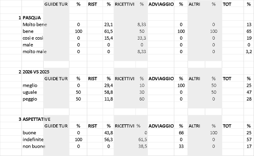 Quasi il 60 per cento degli operatori infatti definisce quantomeno “incerta” la previsione per le prossime settimane, con le incognite maggiori rilevate tra Siena, San Gimignano e la Val di Merse. “Per le nostre strutture ricettive il peso dei visitatori esteri è preponderante – osserva Antonio Munafò, Presidente di Assohotel – è per questo che le prossime settimane rischiano di incidere molto più della Pasqua, quest’anno piuttosto anticipata da calendario, e del primo scorcio di 2026”. Moderata la soddisfazione ad oggi delle guide turistiche: “Molte presenze nei giorni scorsi, ma non altrettanto lavoro per noi – osserva Martina Dei (Federagit) – la Pasqua è per tradizione un momento per viaggi familiari, con meno spazio per tour guidati”.