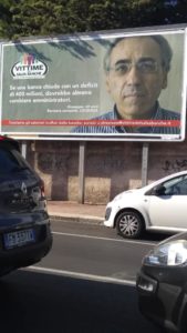 BARI. Sono stati affissi stamani (28 ottobre) nella città di Bari dei mega manifesti a sostegno degli azionisti che vivono momenti drammatici di incertezza riguardo ai propri risparmi. La campagna di sensibilizzazione è stata realizzata dall’Associazione Vittime del Salvabanche che un mese fa, scendendo per la prima volta a Bari, si era impegnata a tutelare gli interessi dei tanti azionisti rimasti intrappolati nella banca.