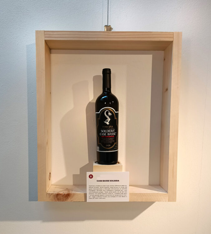 Tante le aziende storiche che hanno collaborato con le proprie bottiglie. Sono presenti Case Basse di Soldera, i brunelli di Poggio di Sotto e Il Colle di Carli. Le Pergole Torte di Montevertine, le aziende del Chianti che ha seguito di più: Bibbiano, Ormanni, Lilliano, San Donatino, Villa Rosa, Cacchiano, Rencine, Fonterutoli. In mostra anche Galatrona di Petrolo, a testimoniare che non era solo maestro di sangiovese. Non mancano le bottiglie celebrative che portano il suo nome come Julius, sempre di Ormanni.