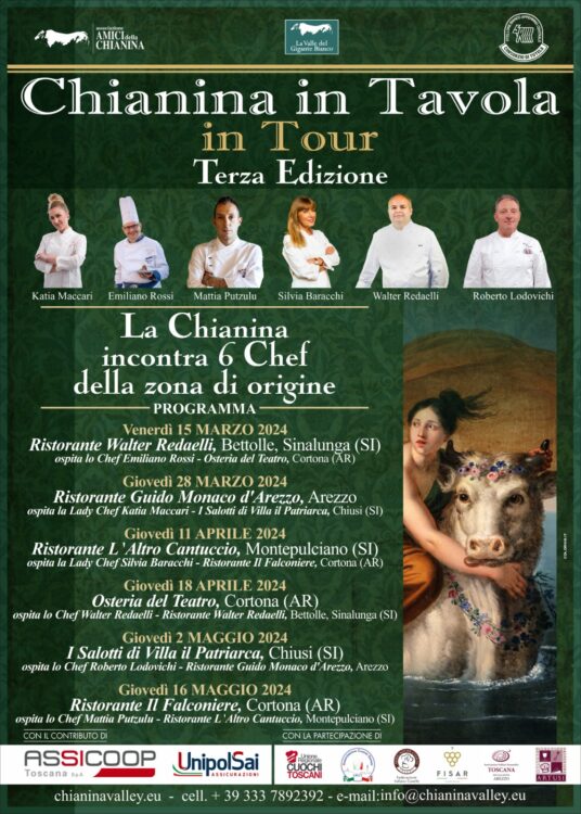 Le cene continueranno giovedì 18 aprile, quando lo chef Emiliano Rossi, dell’’Osteria del Teatro’ di Cortona, ospiterà lo chef Walter Redaelli, del ‘Ristorante Walter Redaelli’ di Bettolle e giovedì 2 maggio con la Lady Chef Katia Maccari, del ristorante ’I Salotti di Villa il Patriarca’ di Chiusi, che ospiterà lo chef Roberto Lodovichi, del ristorante ‘Guido Monaco d’Arezzo. Gli appuntamenti dedicati alla qualità della Chianina si chiuderanno giovedì 16 maggio con la Lady chef Silvia Baracchi, del ristorante ‘Il Falconiere’ di Cortona, che ospiterà lo chef Mattia Putzulu, del ristorante ‘L’Altro Cantuccio’ di Montepulciano. I piatti saranno abbinati a vini di qualità in arrivo dai territori coinvolti nell’iniziativa, presentati e serviti dai sommelier FISAR e AIS.