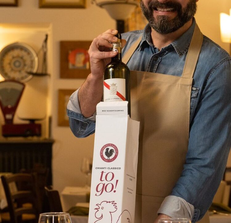 Ma, ecco il messaggio, perché lasciarci? Dopo un’esperienza fatta di condivisione, di gusto, di comunione di sensi, perché separarsi da quella bottiglia che così bene ci ha accompagnato durante la serata? La soluzione, che suggerisce di non rinunciare a un modico calice di vino, sta nel portare via con sé la bottiglia. Per facilitare l’operazione, a titolo gratuito saranno forniti ai ristoranti del territorio e a quelli della zona di Firenze e di Siena scatole da uno (le scatole Chianti Classico To Go) e un tappo brandizzato, per permettere ai propri clienti di indulgere senza esagerare durante la serata, ma piuttosto, portare via con sé per il prossimo futuro il prezioso liquido, frutto del lavoro e della passione dei viticoltori chiantigiani. Come direbbe un antico romano, prosit!