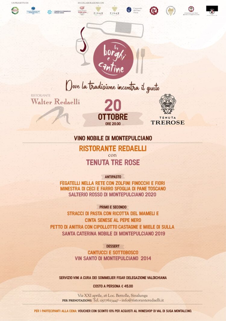 Giovedì 20 ottobre, alle 20.30, i piatti del Ristorante Redaelli a Bettolle insieme ai vini Nobile di Montepulciano Docg della Tenuta Tre Rose