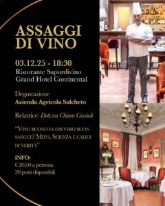 Si inizia già mercoledì prossimo, 3 dicembre, alle 18.30 al Ristorante Sapor di Vino, all’Hotel Continental di Siena, alle 18.30, in via Banchi di Sopra. In degustazione ci saranno i vini di Salcheto, azienda molto conosciuta che produce nella zona di Montepulciano. L’Università di Siena con Chiara Cassioli sarà lì a parlare di “Vino buono fa davvero buon sangue? Mito, scienza e calici di verità”.