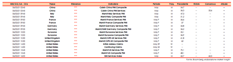 Dalle ore 09:45 alle 10:30: PMI servizi e composito di Italia, Francia, Germania, Eurozona e UK relativi al mese di maggio (finale);