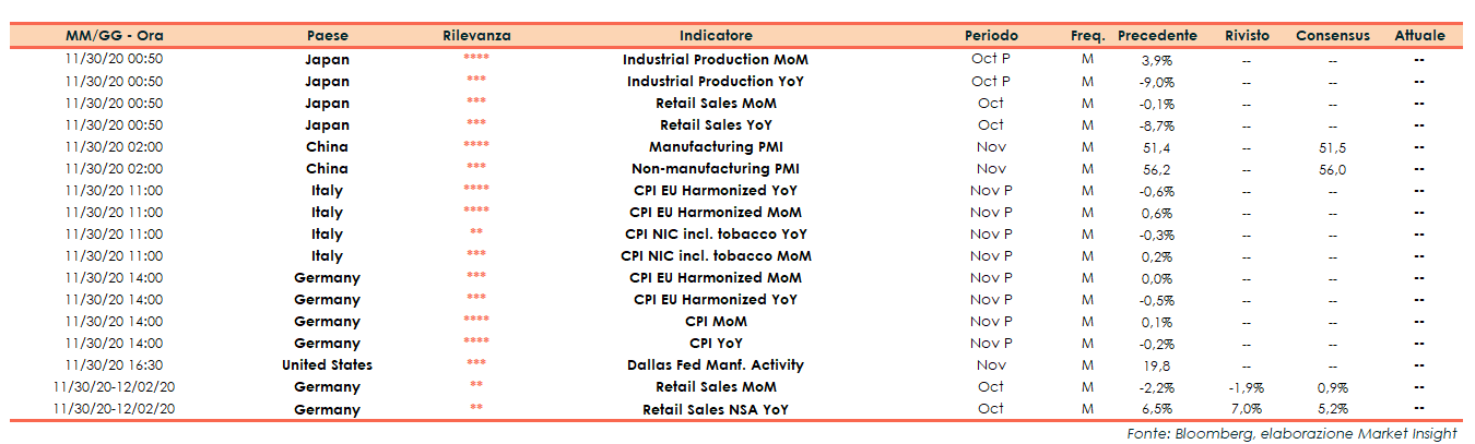Ore 02:00 Cina: PMI manifatturiero e non manifatturiero, novembre;
