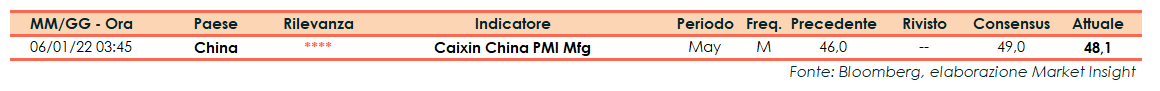 A maggio l’indice Pmi manifatturiero della Cina stilato congiuntamente da Caixin e Markit segna una crescita a 48,1 punti, a fronte dei 49 punti del consensus e ai 46 punti della rilevazione di aprile.