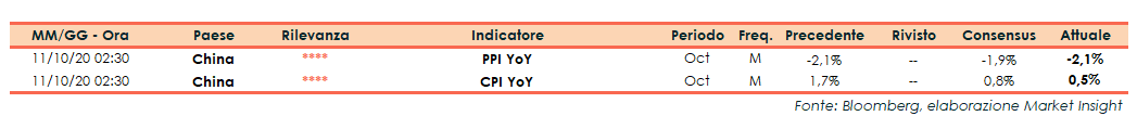 L’Istituto nazionale di statistica della Cina riporta che nel mese di ottobre i prezzi al consumo (CPI) hanno segnato un incremento dello 0,5% su base annua, al di sotto delle attese (0,8%), dopo il +1,7% di settembre.