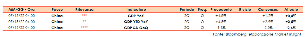 L’Ufficio Nazionale di Statistica di Pechino ha reso noti i dati sul prodotto interno lordo del secondo trimestre 2022 che ha messo a segno un incremento dello 0,4% su base annua, (consensus +1,2%), dopo il +4,8% del primo trimestre 2022.