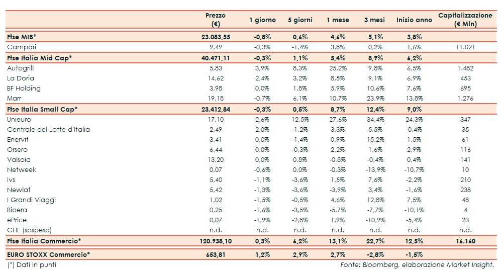 Chiusura in frazionale rialzo per il settore commercio (+0,3%) al di sotto del corrispondente europeo (+1,2%) ma facendo meglio del Ftse Mib (-0,8%).