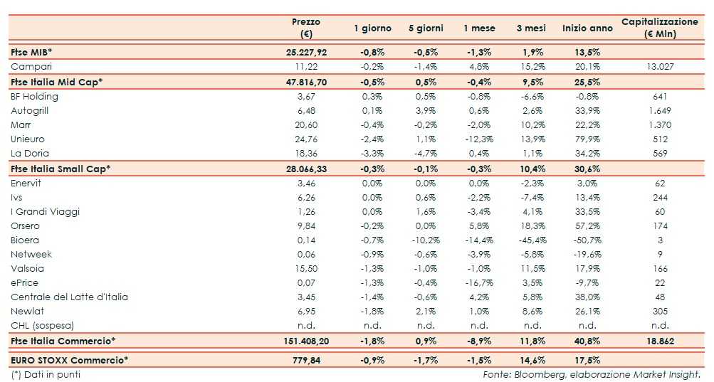 Giornata in calo per il settore commercio (-1,8%), al di sotto del corrispondente europeo (-0,9%) e del Ftse Mib (-0,8%).