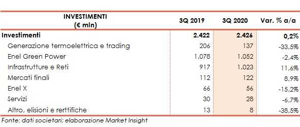 Infine, gli investimenti del terzo trimestre 2020 sono sostanzialmente stabili a 2,4 miliardi (+0,2% a/a). Le risorse si sono concentrate in particolare su Infrastrutture e Reti (+11,6% a 1 miliardi) e sui progetti rinnovabili di Enel Green Power (-2,4% a 1,1 miliardi).