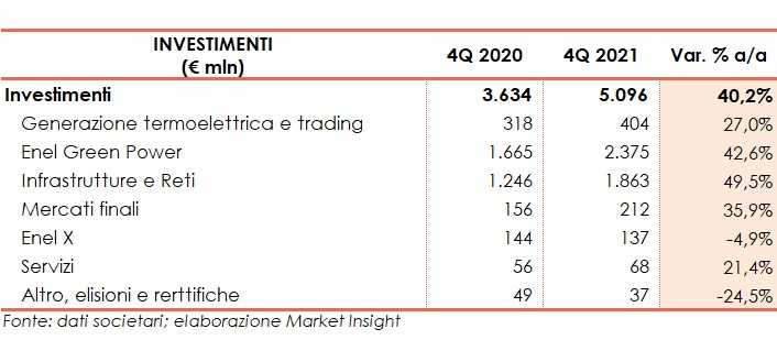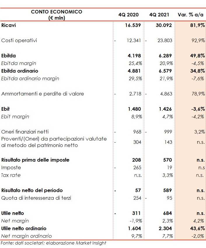 Nel quarto trimestre 2021 il gruppo Enel registra ricavi per 30,1 miliardi, in progresso del 82% rispetto a 16,5 miliardi del pari periodo 2020.