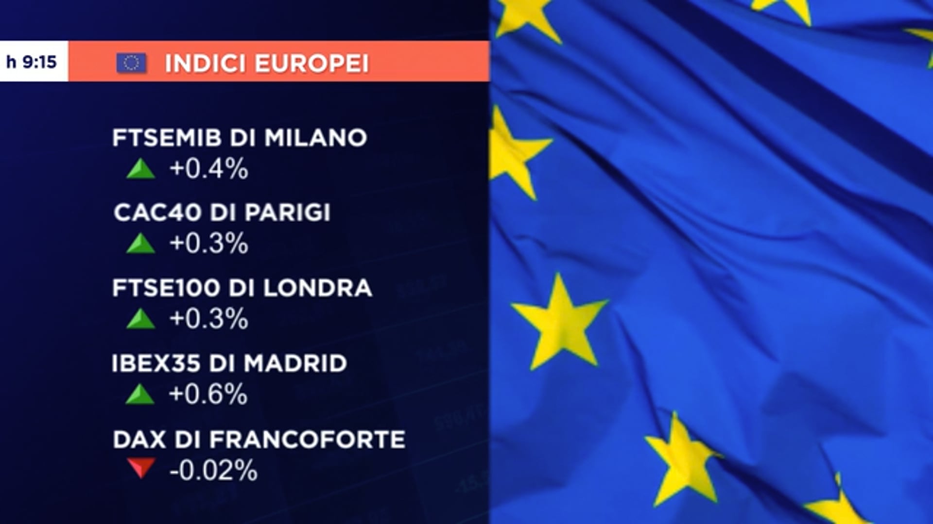 EUROLISTINI POSITIVI IN AVVIO CON PIAZZA AFFARI A +0,4% Data: 14 Settembre 2024 00:09 in: Finanza e Mercati Your browser does not support the video tag. Fonte MarketInsight