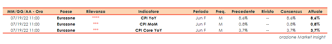 L’Eurostat ha comunicato che nel mese di giugno i prezzi al consumo nell’Eurozona hanno registrato un incremento dello 0,8% su base mensile (dato finale), in linea con il consensus e il dato preliminare. Su base annua i prezzi al consumo hanno riportato un progresso dell’8,6%, anche in questo caso, in linea con le stime e con la rilevazione preliminare.