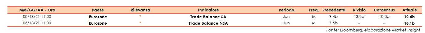 Nel mese di giugno la bilancia commerciale destagionalizzata dell’Eurozona ha segnato un surplus di 12,4 miliardi di euro, in calo rispetto ai 13,8 miliardi di maggio (dato rivisto dalla precedente rilevazione di 9,4 miliardi). Gli analisti si attendevano un surplus di 10,8 miliardi.