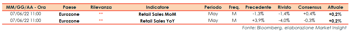 A maggio le vendite al dettaglio nell’Eurozona hanno evidenziato un aumento dello 0,2% su base mensile, a fronte del +0,4% del consensus, dopo il -1,4% di aprile (dato rivisto da -1,3%).