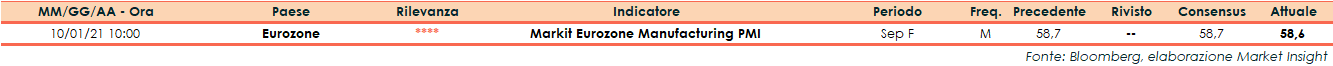 A settembre l’Indice IHS Markit PMI Settore Manifatturiero Eurozona si è attestato a 58,6 punti. La lettura finale si attesta lievemente sotto al consensus degli analisti e alla stima preliminare (entrambe a 58,7 punti).