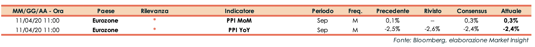 Nel mese di agosto i prezzi alla produzione industriale dell’Eurozona sono aumentati dello 0,3% su base mensile (in linea con il consensus) dopo il +0,1% di agosto. Il dato evidenzia un calo del 2,4% su base annua, in linea con le attese, dopo il -2,6% di agosto (rivisto da -2,5%).