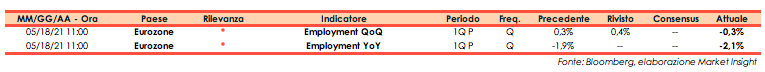 Nel primo trimestre dell’anno il tasso di disoccupazione (preliminare) dell’Eurozona diminuisce dello 0,3%, nel trimestre precedente si era registra una variazione del +0,4% (rivista da +0,3%). Il dato annuale mostra una contrazione del 2,1% rispetto al -1,9% nel 4Q20.