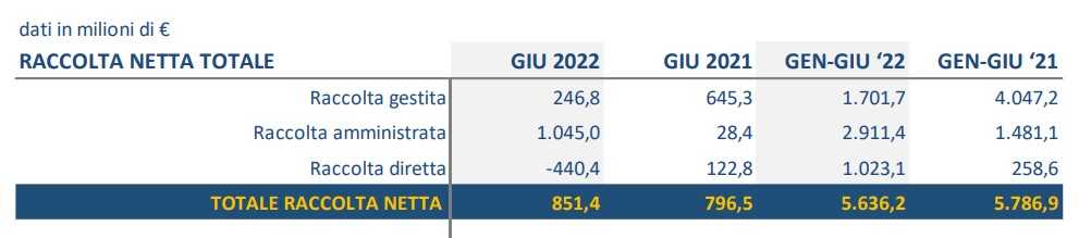 Nel primo semestre 2022 la raccolta netta ha superato 5,6 miliardi, sostanzialmente in linea con il risultato record dello stesso periodo del 2021.