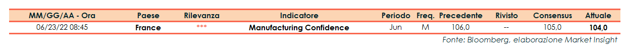 Secondo l’Ufficio Statistico Nazionale Francese (INSEE), a giugno l’indice relativo al sentiment dell’industria manifatturiera si è fissato a 104 punti, al di sotto dei 105 punti del consensus e dei 106 punti di maggio.