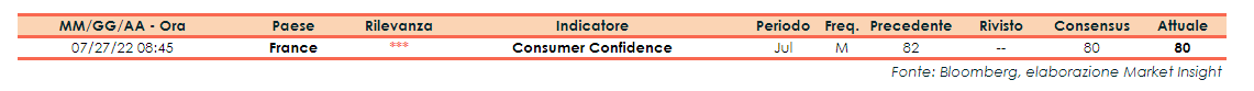 L’Ufficio Statistico Nazionale francese (Insee) ha comunicato che a luglio l’indice che misura la fiducia dei consumatori francesi si è attestato a 80 punti, in calo rispetto a giugno (82 punti) ma in linea con le previsioni degli analisti.