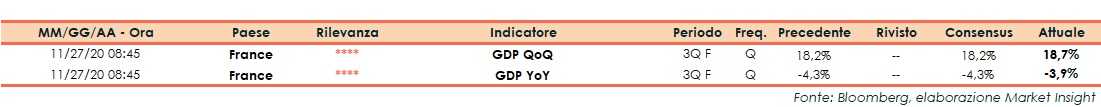 Nel terzo trimestre del 2020 il Pil in Francia (dato finale) ha registrato un rimbalzo del 18,7% su base trimestrale, superiore al consensus e al dato preliminare (+18,2%). Nel secondo trimestre era stato rilevato un crollo congiunturale del 13,7%.