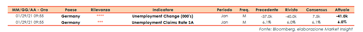 Destatis, l’ufficio di statistica federale tedesco, ha reso noto che nel mese di gennaio il tasso di disoccupazione corretto degli effetti stagionali è rimasto stabile al 6% (6,1% consensus; il dato di dicembre è stato infatti rivisto da 6,1% a 6%).