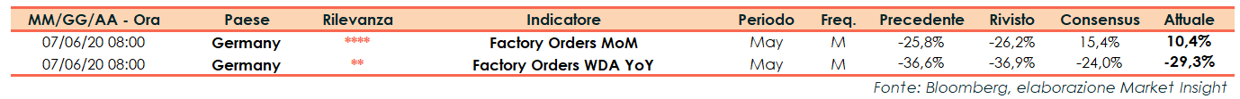 A maggio gli ordini di fabbrica della Germania sono tornati a salire su base mensile (+10,4%). Il dato ha tuttavia deluso le attese degli analisti che si aspettavano un incremento del 15,4% dopo il -26,2% registrato ad aprile (rivisto da -25,8%).