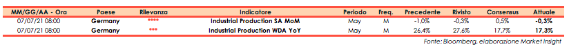 L’Ufficio di Statistica Destatis ha rilevato a maggio un calo della produzione industriale dello 0,3% su base mensile (consensus +0,5%), dopo il -0,3% di aprile (rivisto da -1%).