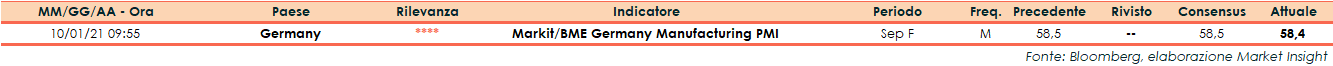 La lettura finale di settembre dell’indice Markit (PMI) manifatturiero della Germania si è attestata a 58,4 punti, sostanzialmente in linea con il consensus degli analisti e con il dato preliminare (entrambi a 58,5 punti).