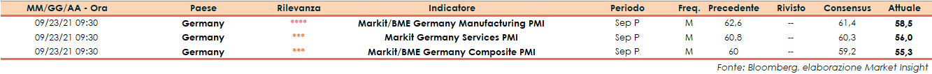 La lettura preliminare di settembre dell’indice Markit (PMI) manifatturiero della Germania si è attestata a 58,5 punti, al di sotto del consensus degli analisti (61,4 punti) e al dato di agosto (62,6 punti).