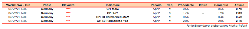Secondo la lettura preliminare diffusa dall’Istituto federale tedesco di statistica, ad aprile l’indice dei prezzi al consumo ha messo a segno un incremento mensile dello 0,7%, dato maggiore rispetto al consensus e alla rilevazione di marzo (+0,5%). Su base annua, l’indice ha registrato un progresso del 2%, anche in questo caso maggiore rispetto al consensus (+1,9%) e al dato di marzo (+1,7%).