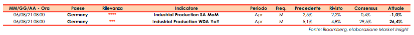 L’Ufficio di Statistica Destatis ha rilevato ad aprile un calo della produzione industriale dell’1% su base mensile (consensus +0,4%), dopo il +2,2% di marzo (rivisto da +2,5%).