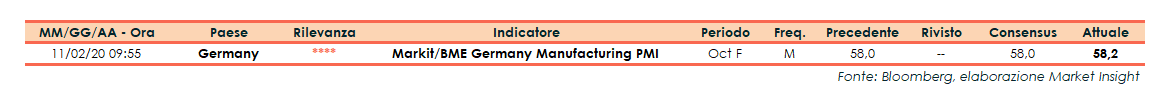 Dalla lettura finale di ottobre dell’indice di Markit Economics, l’Indice Pmi Manifatturiero tedesco si è attestato a 58,2 punti, lievemente al di sopra della rilevazione preliminare e del consensus (58 punti), dopo i 56,4 punti di settembre.