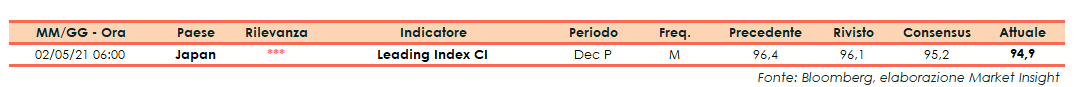 A dicembre il dato preliminare del Leading Index si è attestato a 94,9 punti, al di sotto del consensus (95,2 punti) e del dato di novembre (96,1 punti rivisto da 96,4 punti).