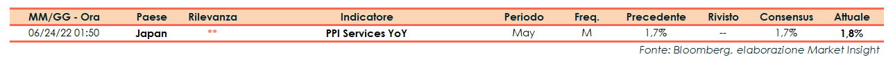 Nel mese di maggio l’indice dei prezzi alla produzione (PPI) dei servizi del Giappone è salito su base annua dell’1,8%, lievemente al di sopra del consensus (+1,7%). La rilevazione di aprile aveva evidenziato un incremento dell’1,7% su base annua.