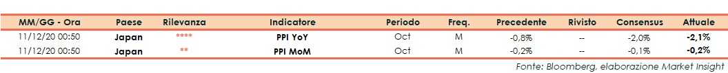 A ottobre l’indice dei prezzi alla produzione in Giappone ha riportato un calo su base mensile dello 0,2%, contro le attese degli analisti che si aspettavano una variazione pari a -0,1%, dopo il -0,2% di settembre.