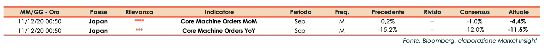 A settembre gli ordinativi di macchinari al settore privato giapponese sono scesi su base mensile (-4,4%), al di sotto delle attese degli analisti che si attendevano una contrazione dell’1% dopo il +0,2% di agosto.